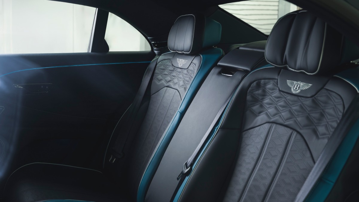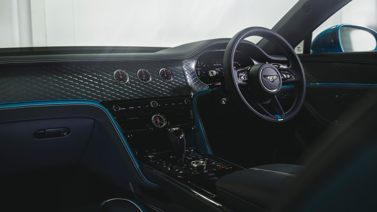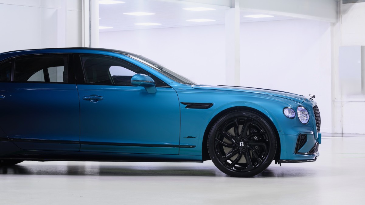 This car is finished in light Topaz Blue at the front, fading to darker Windsor Blue at the back. Other options for customers include Sunburst Gold to Orange Flame and Tungsten to Onyx. Bentley limits the number of combinations to ensure a gradual transition between the two colors, avoiding any interaction between the two chosen hues that could create a third color in the middle of the car. For example, yellow and blue could mix to form green, rather than symmetrically fading from one to the other.