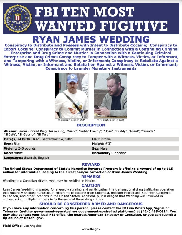 The State Department and Treasury have also sanctioned Wedding, freezing assets and cutting financial ties within the U.S. International agencies including the RCMP and Colombian authorities are cooperating in the search, while FBI leadership has warned that the fugitive is “dangerous and unpredictable.” At 6’3” and 240 pounds, officials say he is hard to miss.