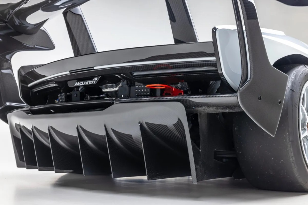 This example wears a clean white exterior over a black Alcantara interior. Outside, it has an anti collision radar system with rear cameras, roof scoop, front and side intakes, polycarbonate windshield and windows, and integrated pneumatic air jacks. The 19 inch staggered center lock wheels are wrapped in Pirelli slicks, and the suspension is straight out of McLaren’s GT3 playbook, with double wishbones, four way adjustable Öhlins dampers and adjustable anti roll bars.