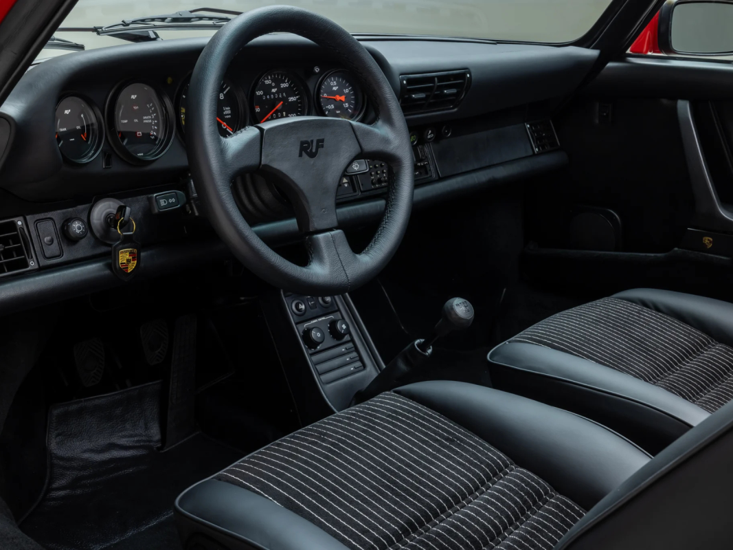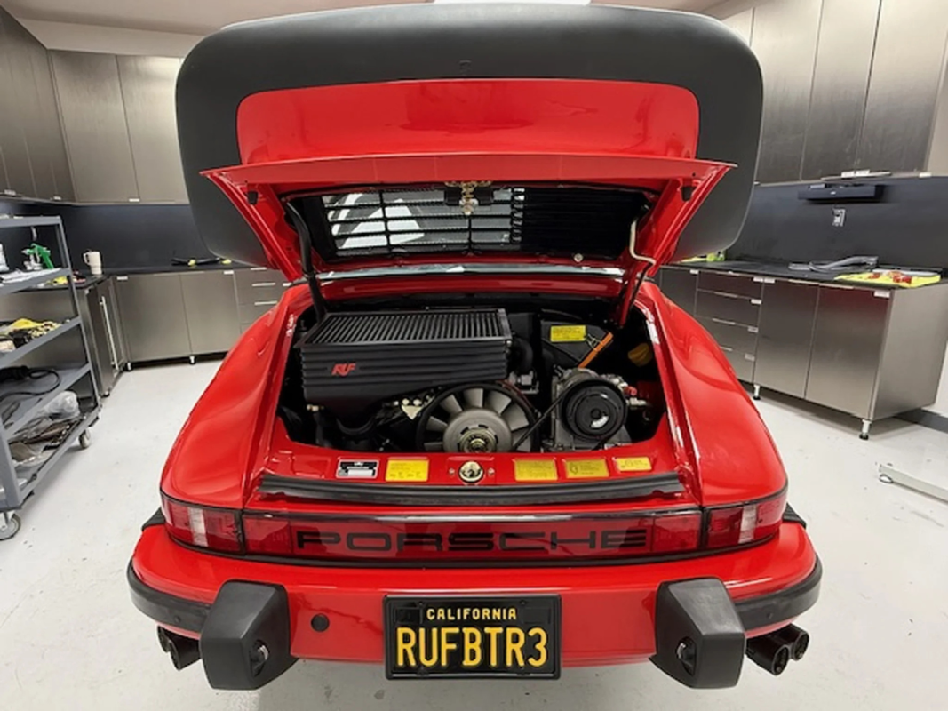 The exterior, meanwhile, has been refinished in its original Guards Red. It also retains RUF conversion components, including a front valance with integrated fog lights, quad exhaust outlets, a rear spoiler, and the tuner’s 17-inch alloy wheels, now fitted with a new set of tires. Inside, the car keeps its original RUF modifications, such as reupholstered front and rear seats trimmed in black leather, a leather-wrapped three-spoke steering wheel, and VDO instrumentation, while receiving new carpeting.